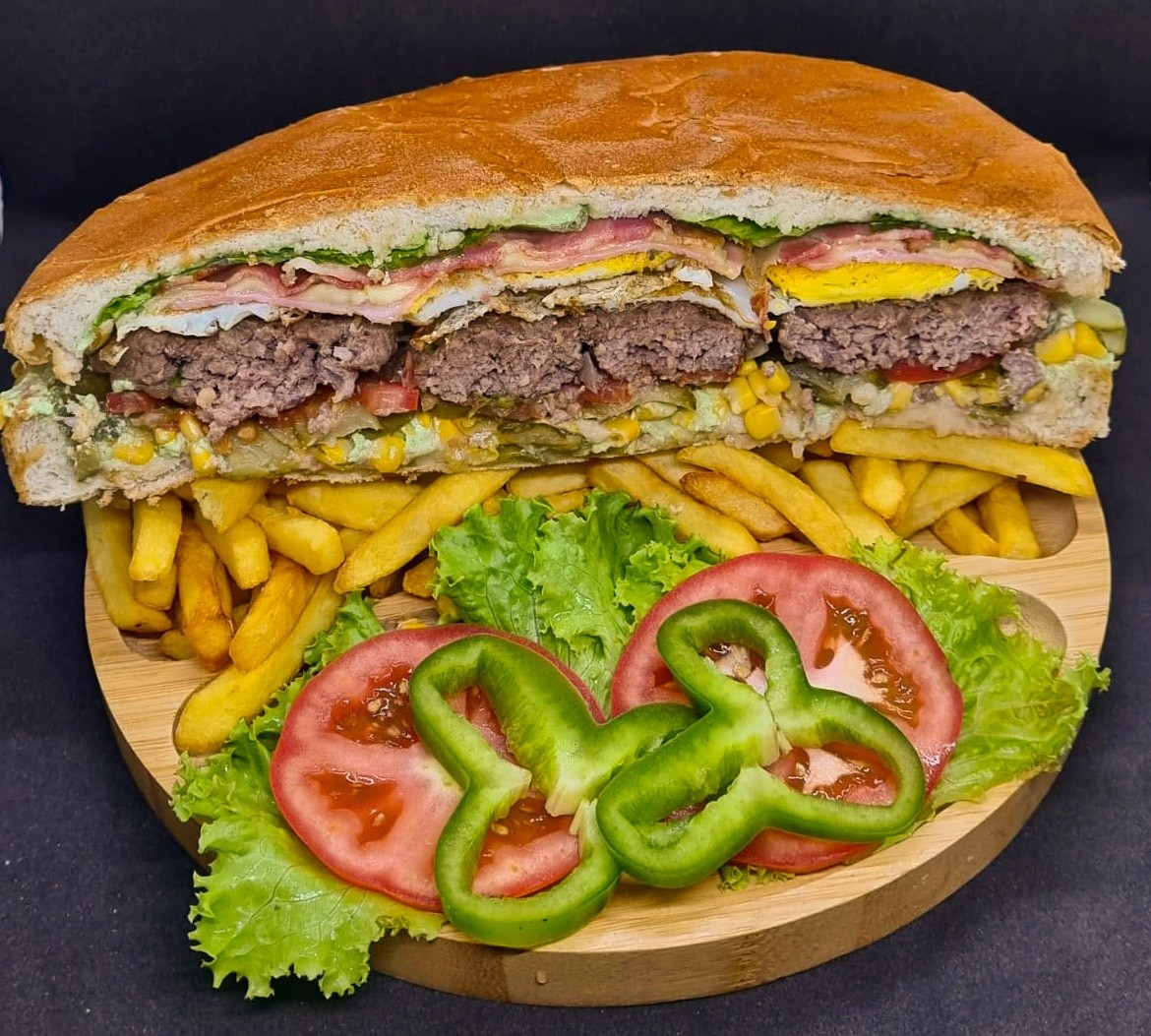 Pão 28cm, Queijo Mussarela, Presunto, Alface, Tomate, Vinagrete, Maionese Caseira, ketchup, Mostarda, ovo, 04 HAMBURGUER ARTESANAL110G, Batata Frita
