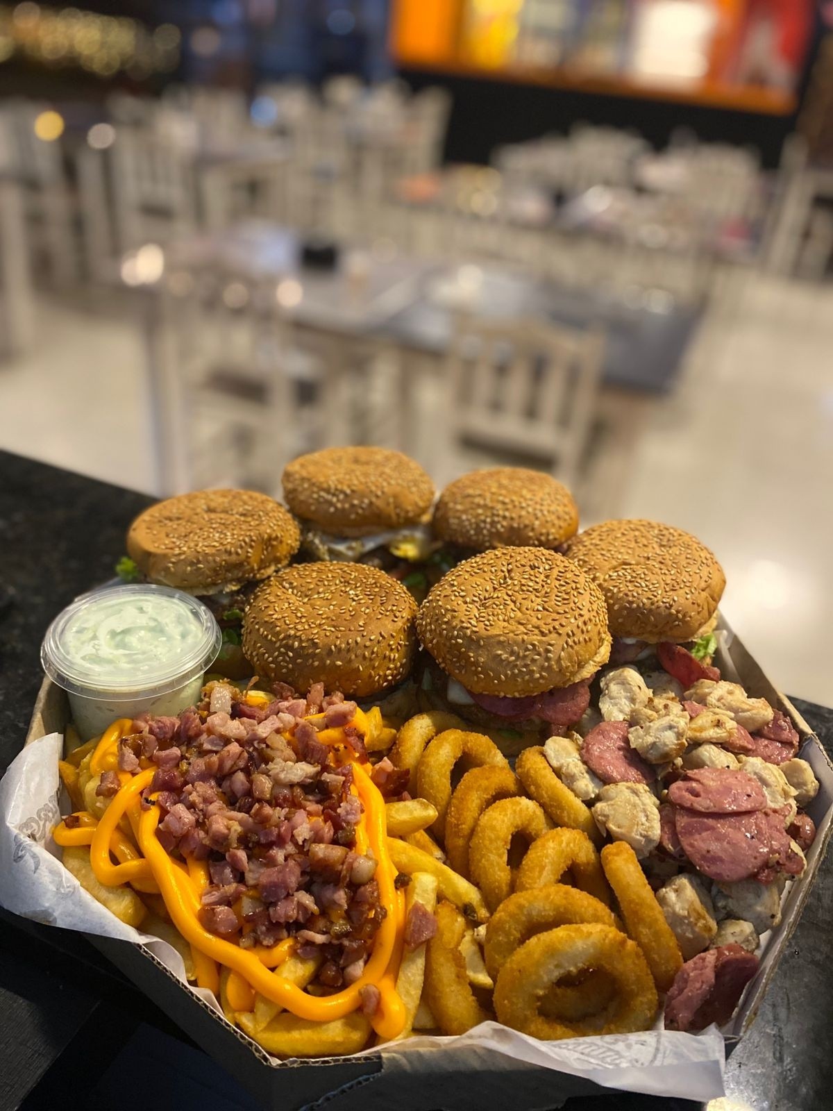 06 chesse pão, maionese, alface, tomate, Hambúrguer 80gr, queijo cheddar e acompanhamento (você escolhe quais você quer, egg, salada, burguer, calabresa ou bacon) 08 onion, batata frita com cheddar e bacon e petisco de frango com calabresa.